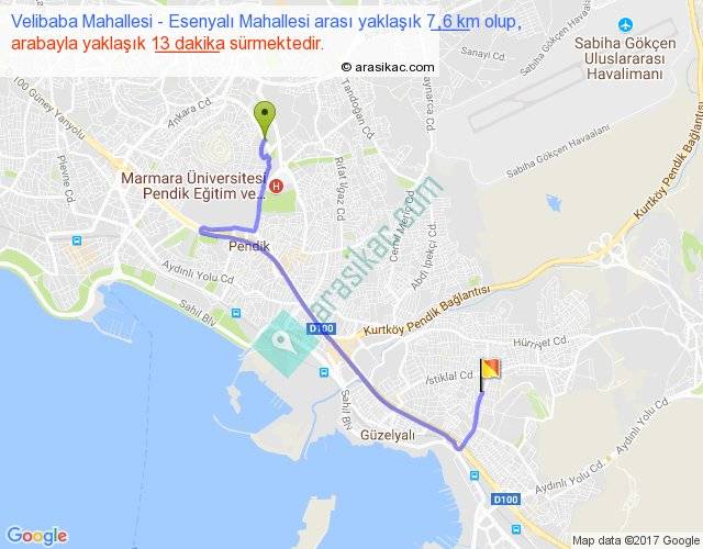 Velibaba Mahallesi - Esenyalı Mahallesi arası yaklaşık olarak 90 km/h ile yukarıda belirtilen sürede olup, iki yerin kuş uçuşu uzaklığı (mesafesi) 4'dir. Yolculuk otobüsle 16 dakika sürmektedir.