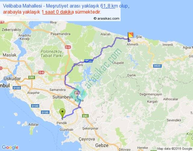 Velibaba Mahallesi - Meşrutiyet arası yaklaşık olarak 90 km/h ile yukarıda belirtilen sürede olup, iki yerin kuş uçuşu uzaklığı (mesafesi) 39'dir. Yolculuk otobüsle 1 saat 18 dakika sürmektedir.