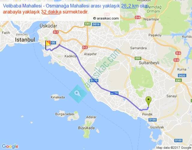 Velibaba Mahallesi - Osmanağa Mahallesi arası yaklaşık olarak 90 km/h ile yukarıda belirtilen sürede olup, iki yerin kuş uçuşu uzaklığı (mesafesi) 22'dir. Yolculuk otobüsle 41 dakika sürmektedir.