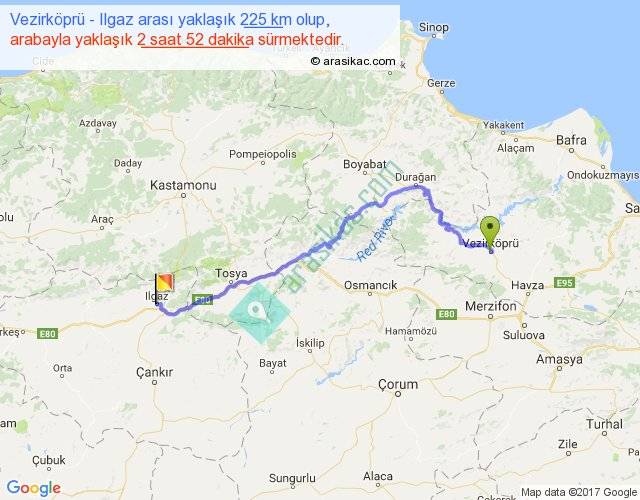 Vezirköprü - Ilgaz arası yaklaşık olarak 90 km/h ile yukarıda belirtilen sürede olup, iki yerin kuş uçuşu uzaklığı (mesafesi) 155'dir. Yolculuk otobüsle 3 saat 43 dakika sürmektedir.