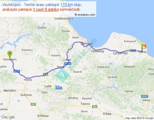 Vezirköprü - Terme arası yaklaşık olarak 90 km/h ile yukarıda belirtilen sürede olup, iki yerin kuş uçuşu uzaklığı (mesafesi) 126'dir. Yolculuk otobüsle 2 saat 46 dakika sürmektedir.