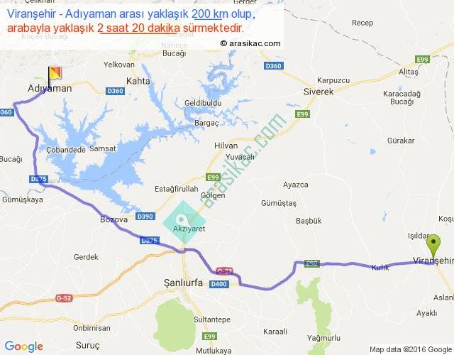 Viranşehir - Adıyaman arası yaklaşık olarak 90 km/h ile yukarıda belirtilen sürede olup, iki yerin kuş uçuşu uzaklığı (mesafesi) 143'dir. Yolculuk otobüsle 3 saat 2 dakika sürmektedir.