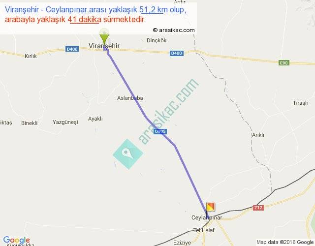 Viranşehir - Ceylanpınar arası yaklaşık olarak 90 km/h ile yukarıda belirtilen sürede olup, iki yerin kuş uçuşu uzaklığı (mesafesi) 49'dir. Yolculuk otobüsle 53 dakika sürmektedir.
