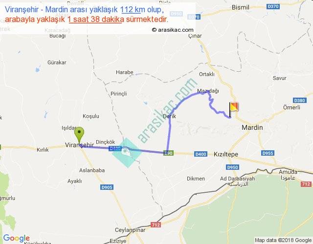 Viranşehir - Mardin arası yaklaşık olarak 90 km/h ile yukarıda belirtilen sürede olup, iki yerin kuş uçuşu uzaklığı (mesafesi) 76'dir. Yolculuk otobüsle 2 saat 7 dakika sürmektedir.