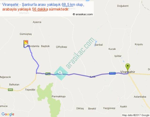 Viranşehir - Şanlıurfa arası yaklaşık olarak 90 km/h ile yukarıda belirtilen sürede olup, iki yerin kuş uçuşu uzaklığı (mesafesi) 85'dir. Yolculuk otobüsle 1 saat 21 dakika sürmektedir.