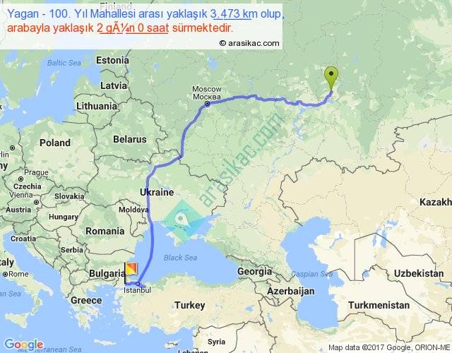Yagan - 100. Yıl Mahallesi arası yaklaşık olarak 90 km/h ile yukarıda belirtilen sürede olup, iki yerin kuş uçuşu uzaklığı (mesafesi) 2513'dir. Eğer belirtilen yerler arasında uçak seferi var ise bu süre uçakla 3 saat 51 dakika'ya kadar düşebilir. Yolculuk otobüsle 2 gün 14 saat sürmektedir.