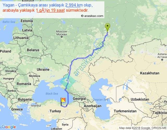 Yagan - Çamlıkaya arası yaklaşık olarak 90 km/h ile yukarıda belirtilen sürede olup, iki yerin kuş uçuşu uzaklığı (mesafesi) 2111'dir. Eğer belirtilen yerler arasında uçak seferi var ise bu süre uçakla 3 saat 14 dakika'ya kadar düşebilir. Yolculuk otobüsle 2 gün 7 saat sürmektedir.