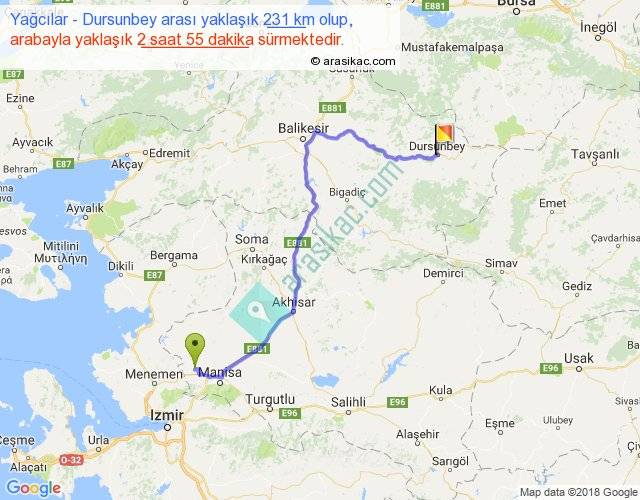 Yağcılar - Dursunbey arası yaklaşık olarak 90 km/h ile yukarıda belirtilen sürede olup, iki yerin kuş uçuşu uzaklığı (mesafesi) 153'dir. Yolculuk otobüsle 3 saat 47 dakika sürmektedir.