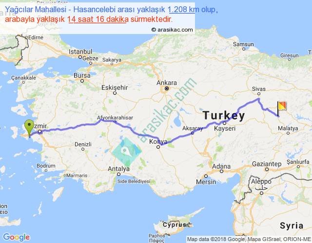 Yağcılar Mahallesi - Hasancelebi arası yaklaşık olarak 90 km/h ile yukarıda belirtilen sürede olup, iki yerin kuş uçuşu uzaklığı (mesafesi) 972'dir. Eğer belirtilen yerler arasında uçak seferi var ise bu süre uçakla 1 saat 29 dakika'ya kadar düşebilir. Yolculuk otobüsle 18 saat 32 dakika sürmektedir.