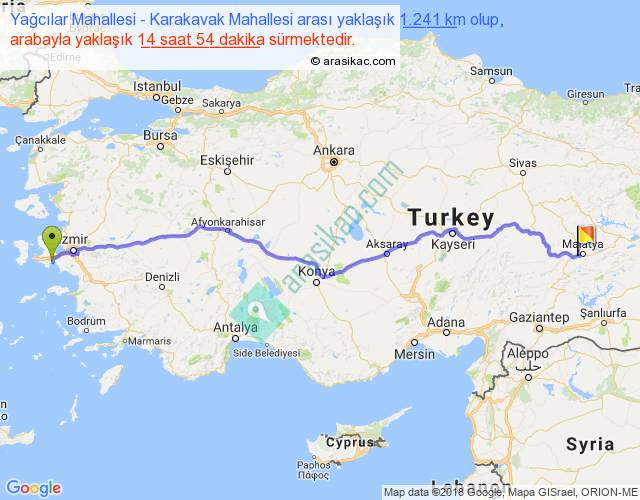 Yağcılar Mahallesi - Karakavak Mahallesi arası yaklaşık olarak 90 km/h ile yukarıda belirtilen sürede olup, iki yerin kuş uçuşu uzaklığı (mesafesi) 1004'dir. Eğer belirtilen yerler arasında uçak seferi var ise bu süre uçakla 1 saat 32 dakika'ya kadar düşebilir. Yolculuk otobüsle 19 saat 22 dakika sürmektedir.