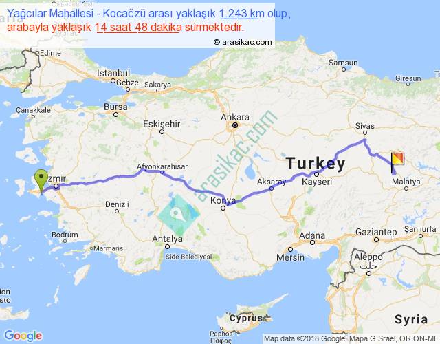 Yağcılar Mahallesi - Kocaözü arası yaklaşık olarak 90 km/h ile yukarıda belirtilen sürede olup, iki yerin kuş uçuşu uzaklığı (mesafesi) 972'dir. Eğer belirtilen yerler arasında uçak seferi var ise bu süre uçakla 1 saat 29 dakika'ya kadar düşebilir. Yolculuk otobüsle 19 saat 14 dakika sürmektedir.