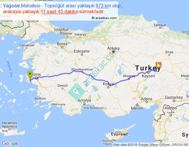 Yağcılar Mahallesi - Topsöğüt arası yaklaşık olarak 90 km/h ile yukarıda belirtilen sürede olup, iki yerin kuş uçuşu uzaklığı (mesafesi) 814'dir. Eğer belirtilen yerler arasında uçak seferi var ise bu süre uçakla 1 saat 15 dakika'ya kadar düşebilir. Yolculuk otobüsle 15 saat 16 dakika sürmektedir.
