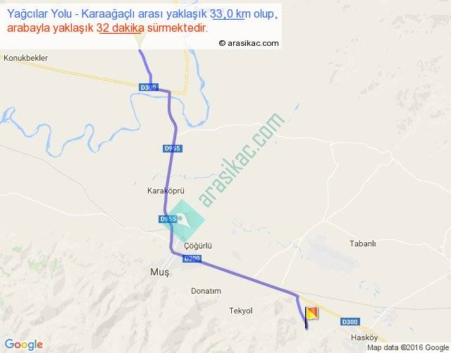 Yağcılar Yolu - Karaağaçlı arası yaklaşık olarak 90 km/h ile yukarıda belirtilen sürede olup, iki yerin kuş uçuşu uzaklığı (mesafesi) 27'dir. Yolculuk otobüsle 41 dakika sürmektedir.