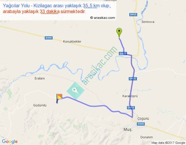 Yağcılar Yolu - Kizilagac arası yaklaşık olarak 90 km/h ile yukarıda belirtilen sürede olup, iki yerin kuş uçuşu uzaklığı (mesafesi) 18'dir. Yolculuk otobüsle 42 dakika sürmektedir.