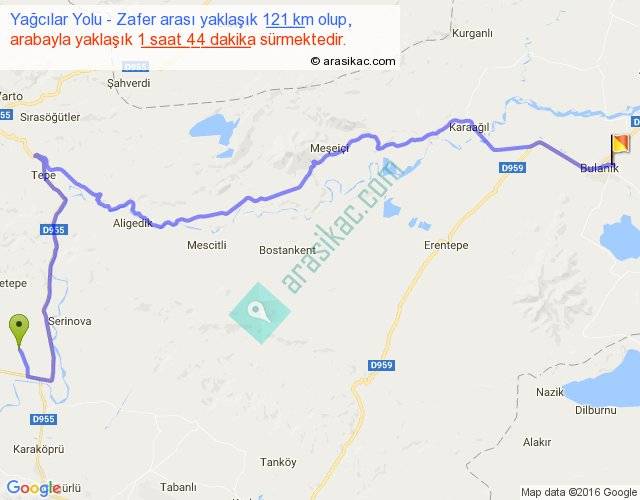 Yağcılar Yolu - Zafer arası yaklaşık olarak 90 km/h ile yukarıda belirtilen sürede olup, iki yerin kuş uçuşu uzaklığı (mesafesi) 73'dir. Yolculuk otobüsle 2 saat 15 dakika sürmektedir.