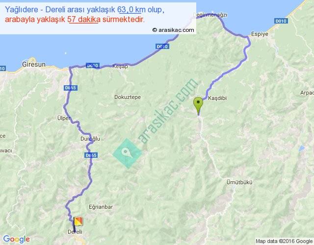 Yağlıdere - Dereli arası yaklaşık olarak 90 km/h ile yukarıda belirtilen sürede olup, iki yerin kuş uçuşu uzaklığı (mesafesi) 20'dir. Yolculuk otobüsle 1 saat 14 dakika sürmektedir.