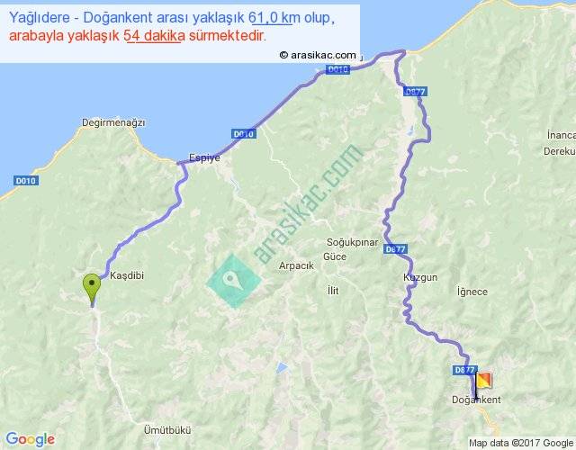Yağlıdere - Doğankent arası yaklaşık olarak 90 km/h ile yukarıda belirtilen sürede olup, iki yerin kuş uçuşu uzaklığı (mesafesi) 25'dir. Yolculuk otobüsle 1 saat 10 dakika sürmektedir.
