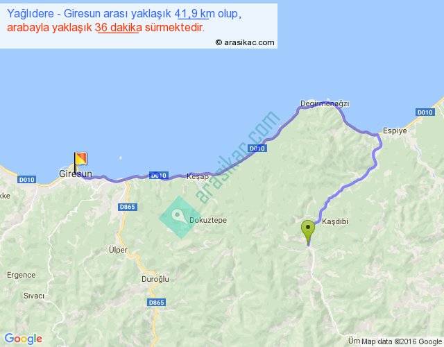 Yağlıdere - Giresun arası yaklaşık olarak 90 km/h ile yukarıda belirtilen sürede olup, iki yerin kuş uçuşu uzaklığı (mesafesi) 20'dir. Yolculuk otobüsle 46 dakika sürmektedir.