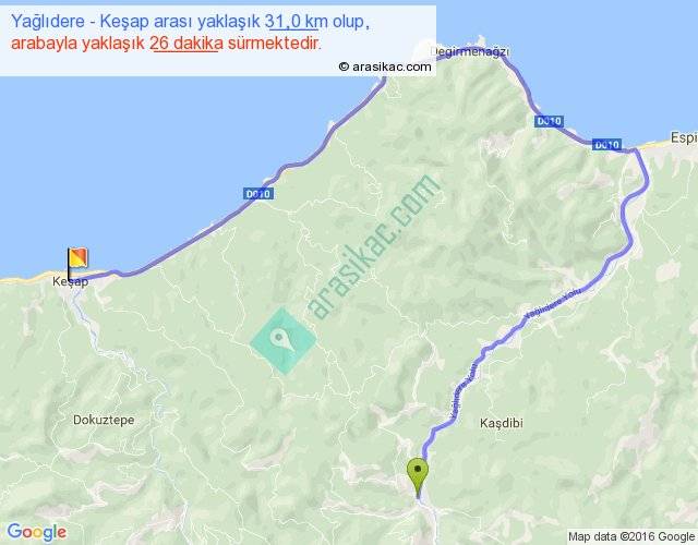 Yağlıdere - Keşap arası yaklaşık olarak 90 km/h ile yukarıda belirtilen sürede olup, iki yerin kuş uçuşu uzaklığı (mesafesi) 11'dir. Yolculuk otobüsle 33 dakika sürmektedir.