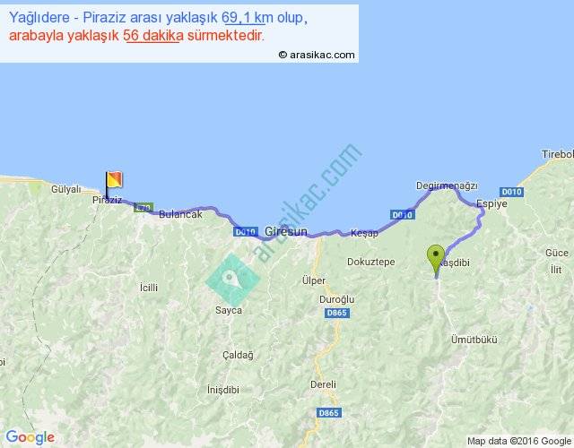 Yağlıdere - Piraziz arası yaklaşık olarak 90 km/h ile yukarıda belirtilen sürede olup, iki yerin kuş uçuşu uzaklığı (mesafesi) 43'dir. Yolculuk otobüsle 1 saat 12 dakika sürmektedir.