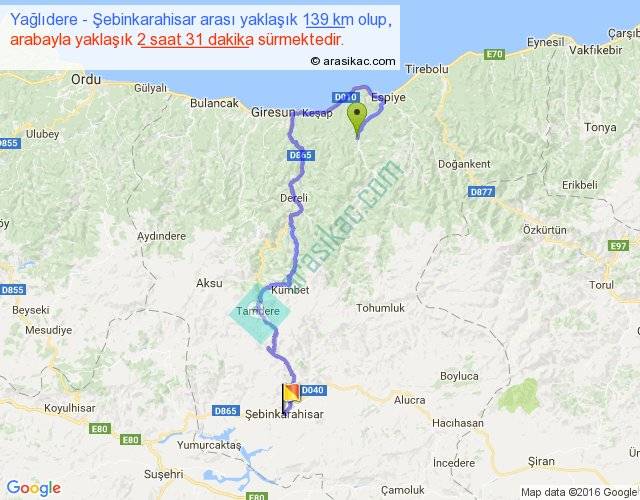 Yağlıdere - Şebinkarahisar arası yaklaşık olarak 90 km/h ile yukarıda belirtilen sürede olup, iki yerin kuş uçuşu uzaklığı (mesafesi) 66'dir. Yolculuk otobüsle 3 saat 16 dakika sürmektedir.