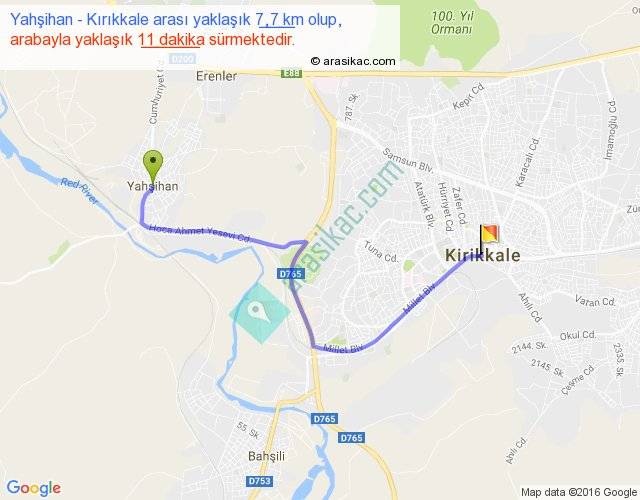 Yahşihan - Kırıkkale arası yaklaşık olarak 90 km/h ile yukarıda belirtilen sürede olup, iki yerin kuş uçuşu uzaklığı (mesafesi) 5'dir. Yolculuk otobüsle 14 dakika sürmektedir.