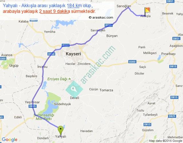 Yahyalı - Akkışla arası yaklaşık olarak 90 km/h ile yukarıda belirtilen sürede olup, iki yerin kuş uçuşu uzaklığı (mesafesi) 122'dir. Yolculuk otobüsle 2 saat 47 dakika sürmektedir.