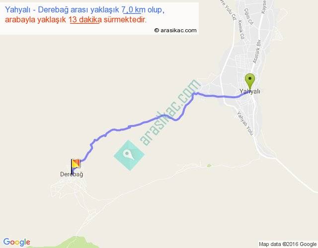 Yahyalı - Derebağ arası yaklaşık olarak 90 km/h ile yukarıda belirtilen sürede olup, iki yerin kuş uçuşu uzaklığı (mesafesi) 6'dir. Yolculuk otobüsle 16 dakika sürmektedir.
