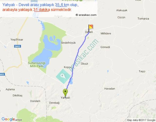 Yahyalı - Develi arası yaklaşık olarak 90 km/h ile yukarıda belirtilen sürede olup, iki yerin kuş uçuşu uzaklığı (mesafesi) 34'dir. Yolculuk otobüsle 42 dakika sürmektedir.
