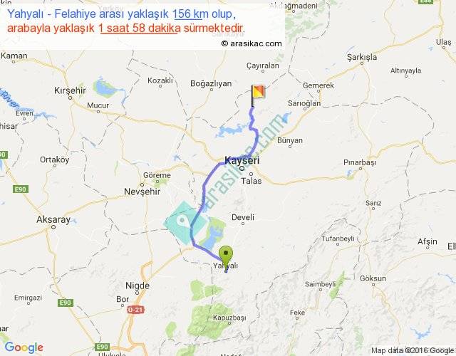 Yahyalı - Felahiye arası yaklaşık olarak 90 km/h ile yukarıda belirtilen sürede olup, iki yerin kuş uçuşu uzaklığı (mesafesi) 111'dir. Yolculuk otobüsle 2 saat 33 dakika sürmektedir.