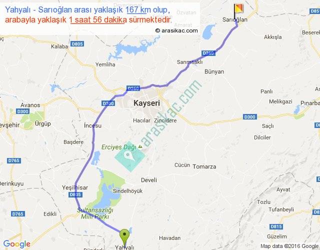 Yahyalı - Sarıoğlan arası yaklaşık olarak 90 km/h ile yukarıda belirtilen sürede olup, iki yerin kuş uçuşu uzaklığı (mesafesi) 120'dir. Yolculuk otobüsle 2 saat 30 dakika sürmektedir.