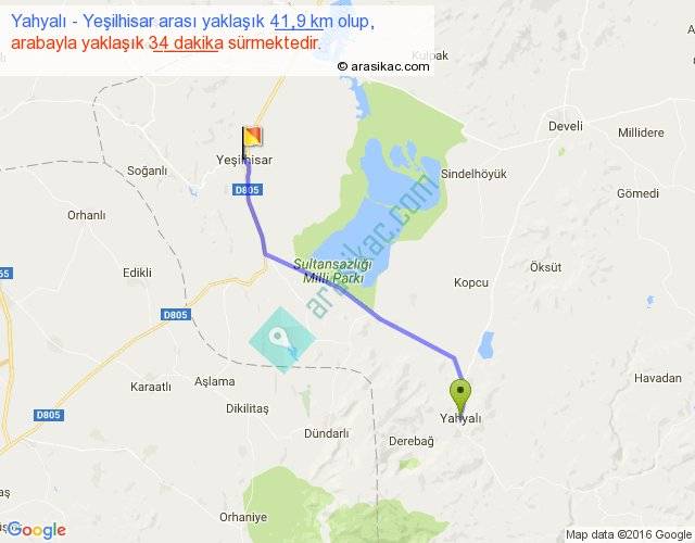 Yahyalı - Yeşilhisar arası yaklaşık olarak 90 km/h ile yukarıda belirtilen sürede olup, iki yerin kuş uçuşu uzaklığı (mesafesi) 37'dir. Yolculuk otobüsle 44 dakika sürmektedir.