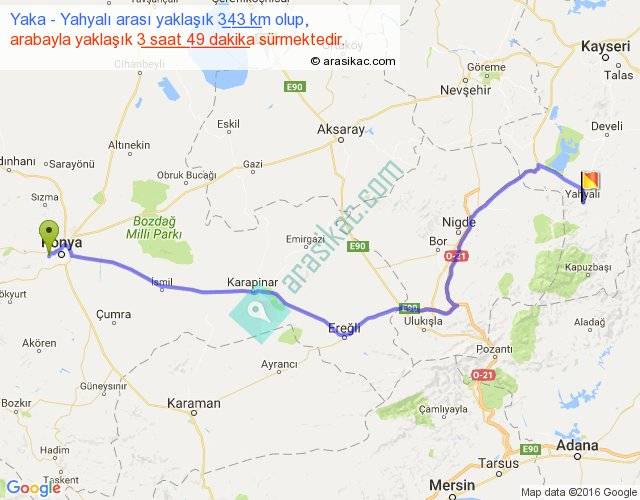 Yaka - Yahyalı arası yaklaşık olarak 90 km/h ile yukarıda belirtilen sürede olup, iki yerin kuş uçuşu uzaklığı (mesafesi) 257'dir. Eğer belirtilen yerler arasında uçak seferi var ise bu süre uçakla 23 dakika'ya kadar düşebilir. Yolculuk otobüsle 4 saat 57 dakika sürmektedir.