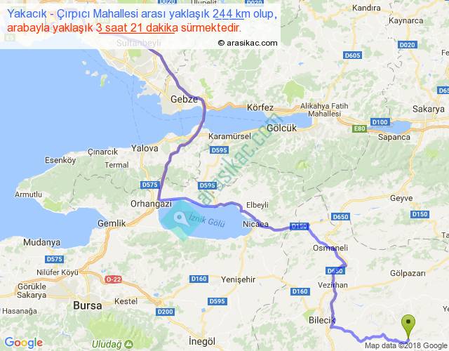 Yakacık - Çırpıcı Mahallesi arası yaklaşık olarak 90 km/h ile yukarıda belirtilen sürede olup, iki yerin kuş uçuşu uzaklığı (mesafesi) 156'dir. Yolculuk otobüsle 4 saat 21 dakika sürmektedir.