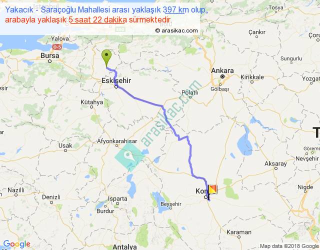 Yakacık - Saraçoğlu Mahallesi arası yaklaşık olarak 90 km/h ile yukarıda belirtilen sürede olup, iki yerin kuş uçuşu uzaklığı (mesafesi) 316'dir. Eğer belirtilen yerler arasında uçak seferi var ise bu süre uçakla 29 dakika'ya kadar düşebilir. Yolculuk otobüsle 6 saat 58 dakika sürmektedir.