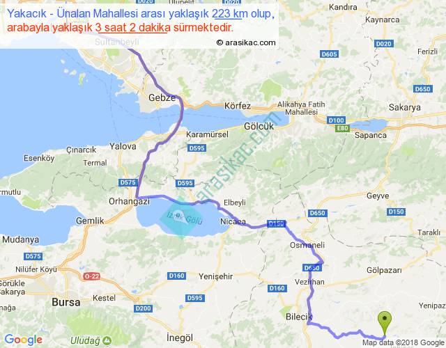 Yakacık - Ünalan Mahallesi arası yaklaşık olarak 90 km/h ile yukarıda belirtilen sürede olup, iki yerin kuş uçuşu uzaklığı (mesafesi) 146'dir. Yolculuk otobüsle 3 saat 56 dakika sürmektedir.