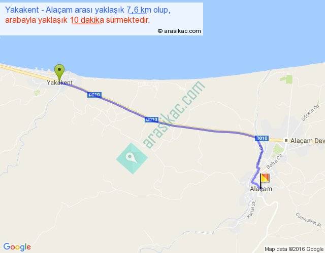 Yakakent - Alaçam arası yaklaşık olarak 90 km/h ile yukarıda belirtilen sürede olup, iki yerin kuş uçuşu uzaklığı (mesafesi) 6'dir. Yolculuk otobüsle 13 dakika sürmektedir.