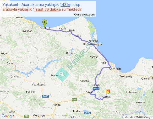 Yakakent - Asarcık arası yaklaşık olarak 90 km/h ile yukarıda belirtilen sürede olup, iki yerin kuş uçuşu uzaklığı (mesafesi) 88'dir. Yolculuk otobüsle 2 saat 30 dakika sürmektedir.