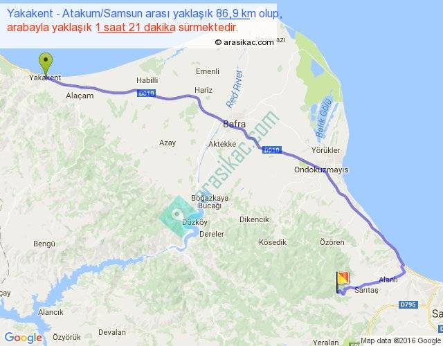 Yakakent - Atakum Samsun arası yaklaşık olarak 90 km/h ile yukarıda belirtilen sürede olup, iki yerin kuş uçuşu uzaklığı (mesafesi) 60'dir. Yolculuk otobüsle 1 saat 45 dakika sürmektedir.