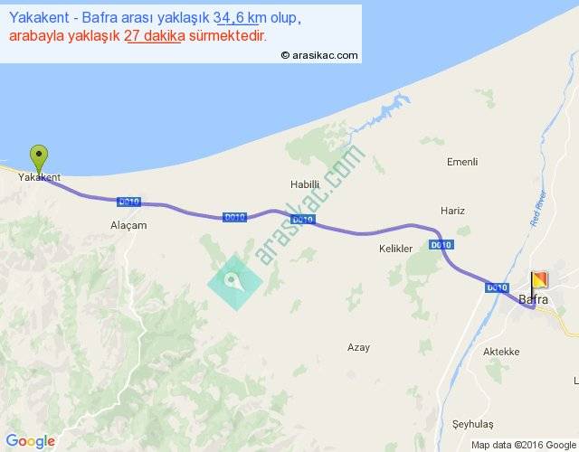 Yakakent - Bafra arası yaklaşık olarak 90 km/h ile yukarıda belirtilen sürede olup, iki yerin kuş uçuşu uzaklığı (mesafesi) 32'dir. Yolculuk otobüsle 35 dakika sürmektedir.