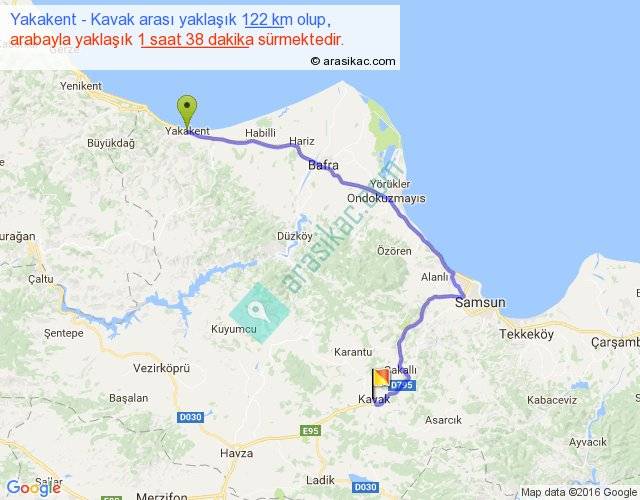 Yakakent - Kavak arası yaklaşık olarak 90 km/h ile yukarıda belirtilen sürede olup, iki yerin kuş uçuşu uzaklığı (mesafesi) 74'dir. Yolculuk otobüsle 2 saat 7 dakika sürmektedir.