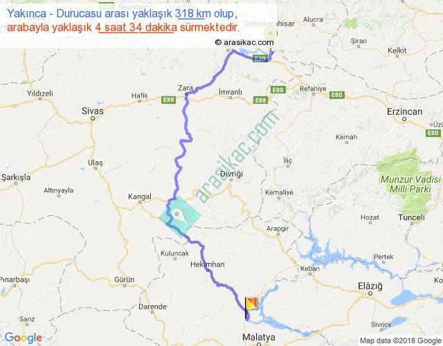Yakınca - Durucasu arası yaklaşık olarak 90 km/h ile yukarıda belirtilen sürede olup, iki yerin kuş uçuşu uzaklığı (mesafesi) 182'dir. Yolculuk otobüsle 5 saat 56 dakika sürmektedir.