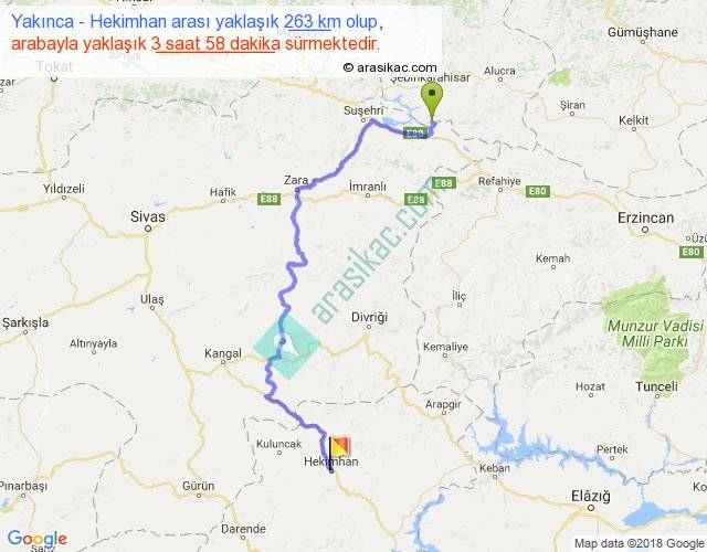 Yakınca - Hekimhan arası yaklaşık olarak 90 km/h ile yukarıda belirtilen sürede olup, iki yerin kuş uçuşu uzaklığı (mesafesi) 154'dir. Yolculuk otobüsle 5 saat 9 dakika sürmektedir.