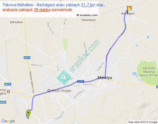 Yakınca Mahallesi - Battalgazi arası yaklaşık olarak 90 km/h ile yukarıda belirtilen sürede olup, iki yerin kuş uçuşu uzaklığı (mesafesi) 17'dir. Yolculuk otobüsle 36 dakika sürmektedir.
