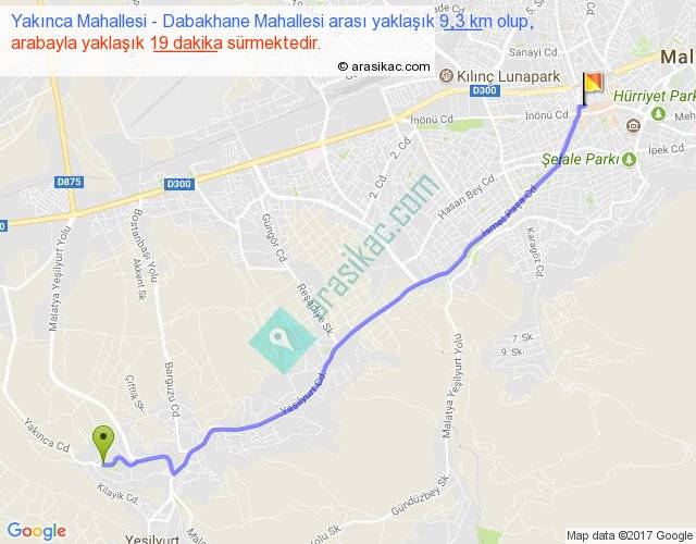 Yakınca Mahallesi - Dabakhane Mahallesi arası yaklaşık olarak 90 km/h ile yukarıda belirtilen sürede olup, iki yerin kuş uçuşu uzaklığı (mesafesi) 8'dir. Yolculuk otobüsle 24 dakika sürmektedir.
