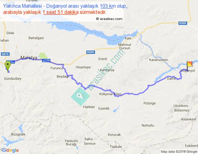 Yakınca Mahallesi - Doğanyol arası yaklaşık olarak 90 km/h ile yukarıda belirtilen sürede olup, iki yerin kuş uçuşu uzaklığı (mesafesi) 69'dir. Yolculuk otobüsle 2 saat 24 dakika sürmektedir.