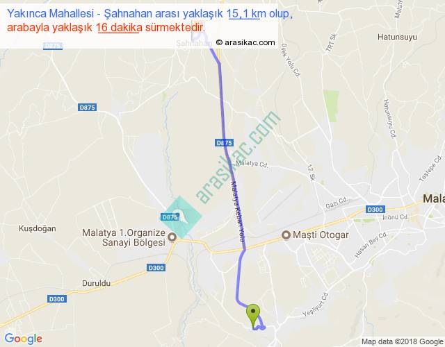 Yakınca Mahallesi - Şahnahan arası yaklaşık olarak 90 km/h ile yukarıda belirtilen sürede olup, iki yerin kuş uçuşu uzaklığı (mesafesi) 13'dir. Yolculuk otobüsle 20 dakika sürmektedir.