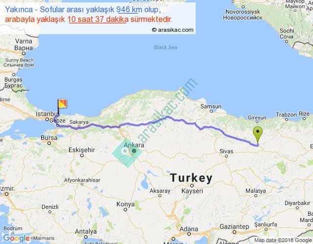 Yakınca - Sofular arası yaklaşık olarak 90 km/h ile yukarıda belirtilen sürede olup, iki yerin kuş uçuşu uzaklığı (mesafesi) 757'dir. Eğer belirtilen yerler arasında uçak seferi var ise bu süre uçakla 1 saat 09 dakika'ya kadar düşebilir. Yolculuk otobüsle 13 saat 48 dakika sürmektedir.