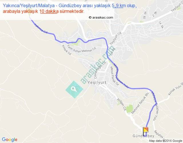 Yakınca Yeşilyurt Malatya - Gündüzbey arası yaklaşık olarak 90 km/h ile yukarıda belirtilen sürede olup, iki yerin kuş uçuşu uzaklığı (mesafesi) 4'dir. Yolculuk otobüsle 13 dakika sürmektedir.
