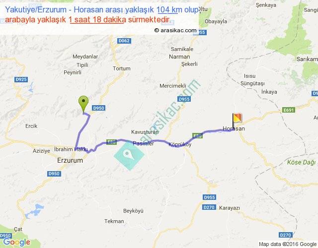 Yakutiye Erzurum - Horasan arası yaklaşık olarak 90 km/h ile yukarıda belirtilen sürede olup, iki yerin kuş uçuşu uzaklığı (mesafesi) 71'dir. Yolculuk otobüsle 1 saat 41 dakika sürmektedir.